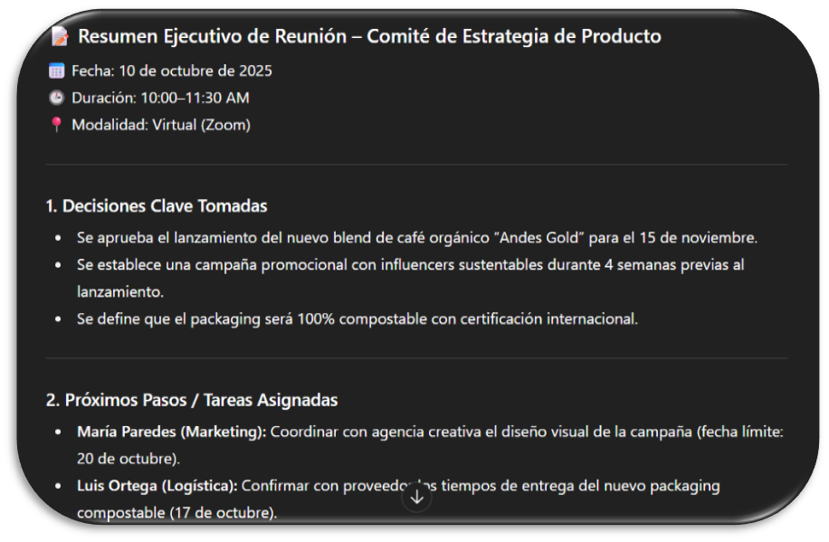 Problema que Resuelve: Sobrecarga de información y dificultad para extraer los puntos de acción y decisiones clave de textos largos.