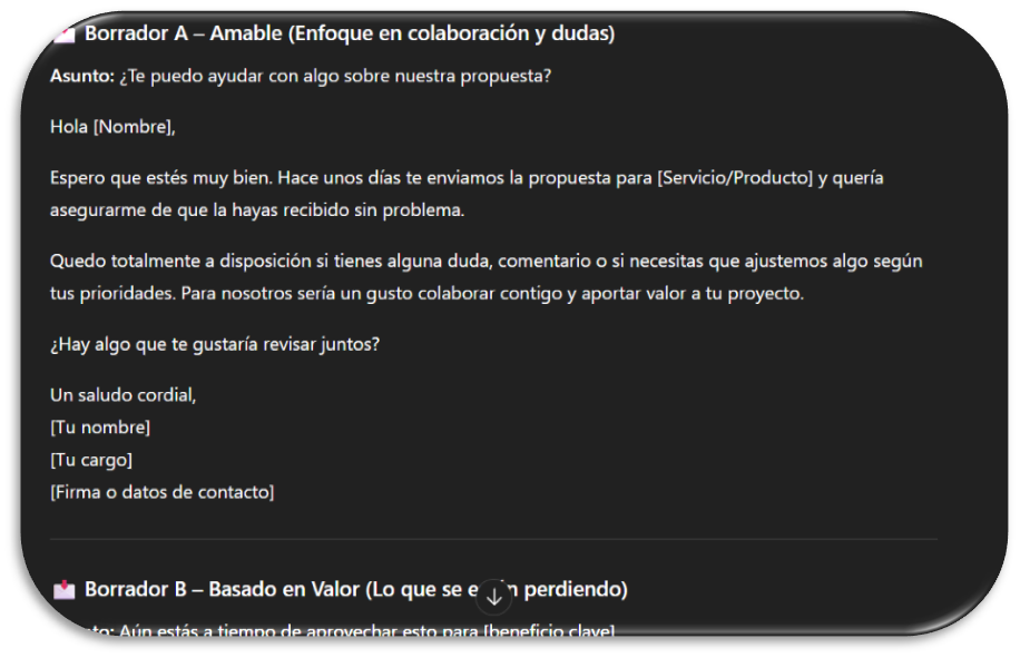 Por Qué Funciona: Le pides variantes de la misma comunicación. Esto te permite elegir la estrategia más adecuada al contexto del cliente sin perder tiempo en crear cada uno desde cero. Simplemente eliges y personalizas 30 segundos.