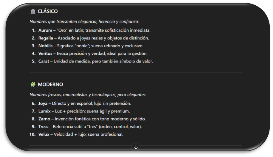 Por Qué Funciona: Le exiges no solo la cantidad (20 nombres), sino también la calidad y la segmentación por estilo (Clásico, Moderno, etc.). Esto acelera el proceso de decisión, ya que tienes opciones variadas y filtradas por concepto.